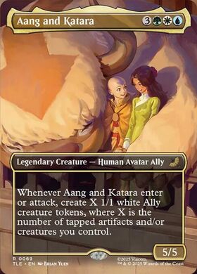 Oracle Text: Whenever Aang and Katara enter or attack, create X 1/1 white Ally creature tokens, where X is the number of tapped artifacts and/or creatures you control.
