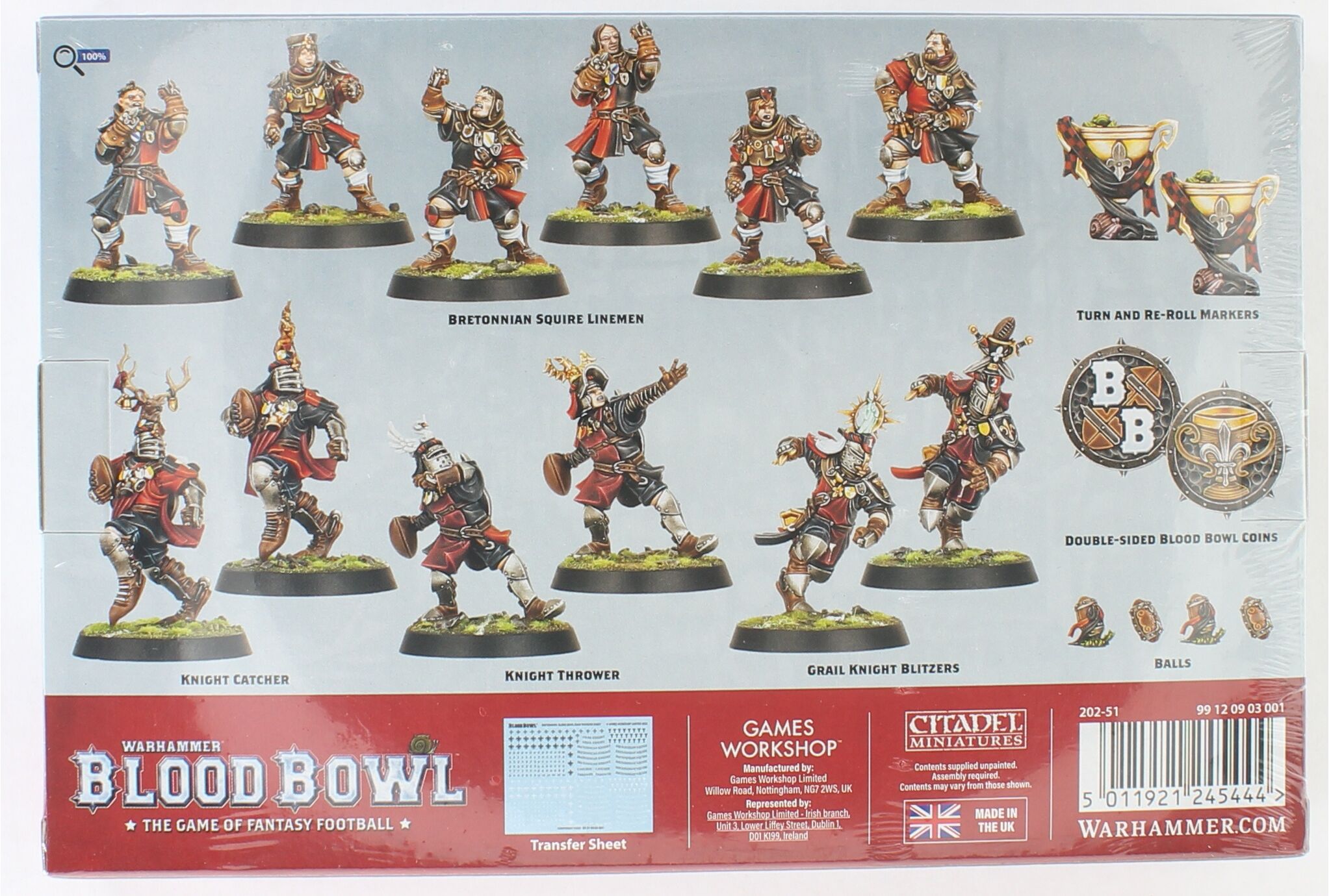 The nobles of Bretonnia charge onto the Blood Bowl pitch in full regalia, bringing their chivalric might and unshakable loyalty to the beautiful (and brutal) game. Backed by stalwart Squires and armoured Knights, these teams excel at smashing through defensive lines and storming their way to the end zone with noble determination. Each team set includes 12 multipart plastic players six Bretonnian Squire Linemen, two Knight Catchers, two Knight Throwers, and two Grail Knight Blitzers alongside two double-sided team coins, two Turn and Re-roll markers, and four footballs to keep the action flowing. The set also includes a Bretonnian Team transfer sheet boasting 320 individual transfers, perfect for giving your players the heraldic flair they deserve.