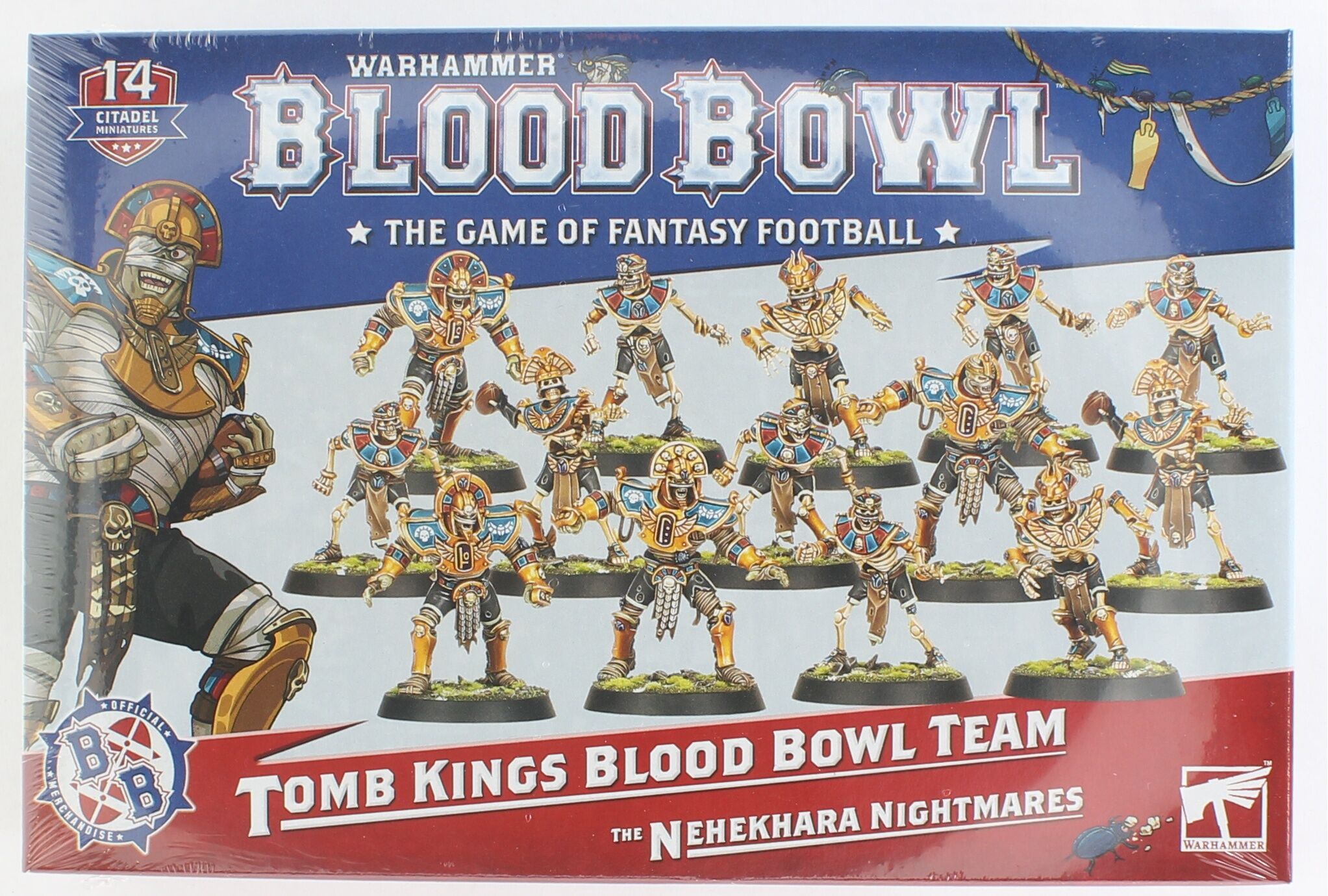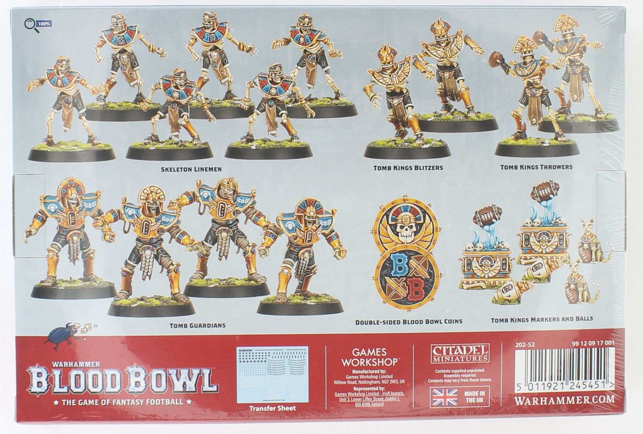 The Tomb Kings rise once more, bringing a touch of ancient grandeur and eternal precision to the Blood Bowl pitch. Each team set includes 14 multipart plastic players two Tomb Kings Blitzers, two Tomb Kings Throwers, four mighty Tomb Guardians, and six Skeleton Linemen along with two double-sided team coins, two Turn and Re-roll markers, and four footballs to keep the game in motion. To crown their ancient glory, the set also includes a Tomb Kings Team transfer sheet featuring 298 individual decals, perfect for adorning your players in regal symbols of eternal domination.
