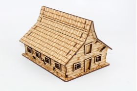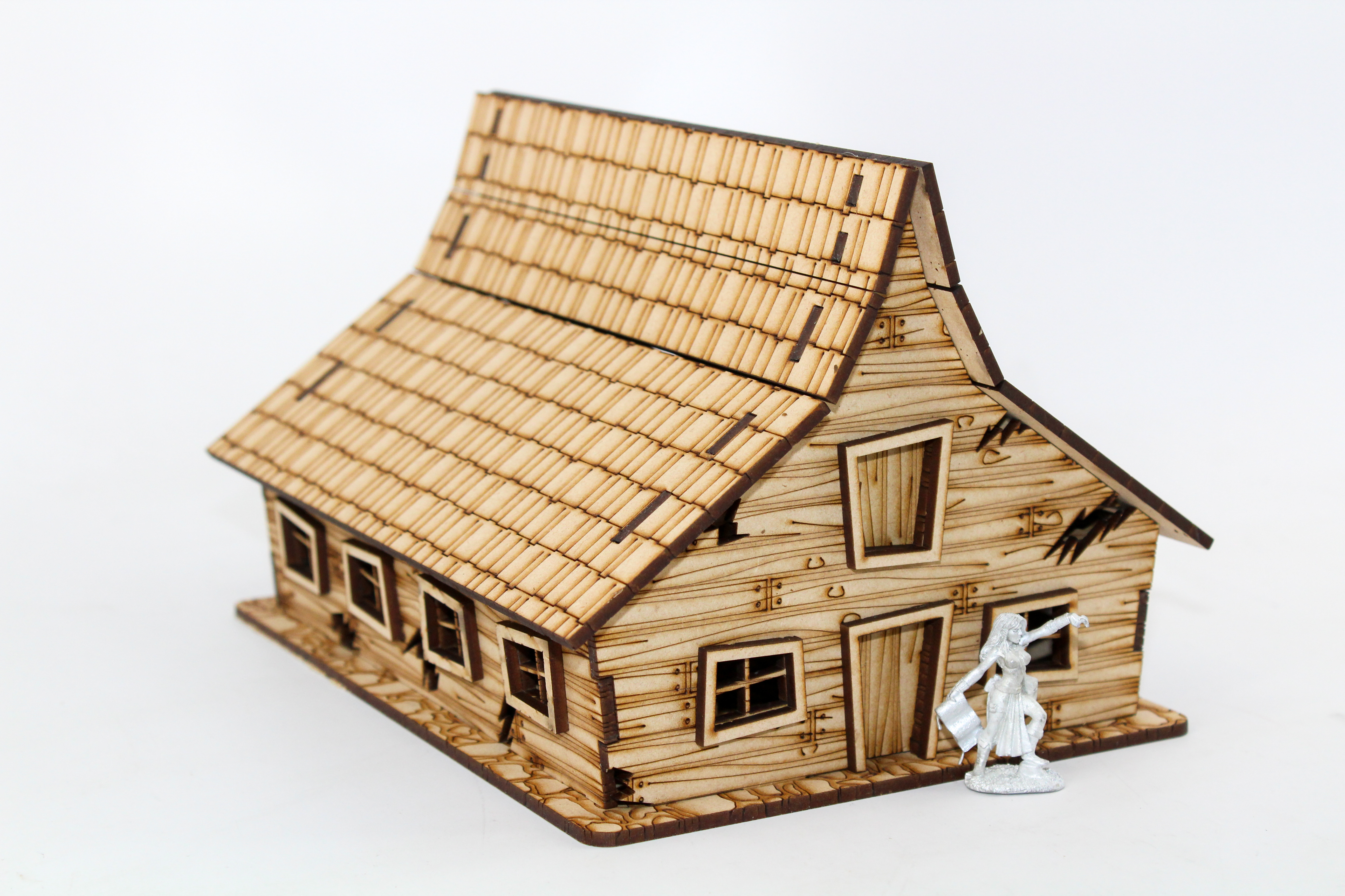 Home to beasts and harvest the village barn is the single largest structure in the Wicked Forest with a footprint of 7-7/8 by 6 inches and rising 5-1/8 inches into the air. Walls feature laser etched wood planks and the roof detail is tiling. The crooked building has several holes and shifting window & door frames. The doors and roof are removable to allow interior play. The hayloft is also removable to provide better access to the floor. All pieces are cut from sturdy 3mm MDF board. This kit ships unassembled and unpainted.