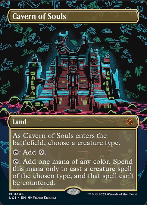 Oracle Text: As Cavern of Souls enters the battlefield, choose a creature type. {T}: Add {C}. {T}: Add one mana of any color. Spend this mana only to cast a creature spell of the chosen type, and that spell can't be countered.