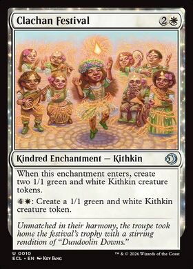 Oracle Text: When this enchantment enters, create two 1/1 green and white Kithkin creature tokens. {4}{W}: Create a 1/1 green and white Kithkin creature token.