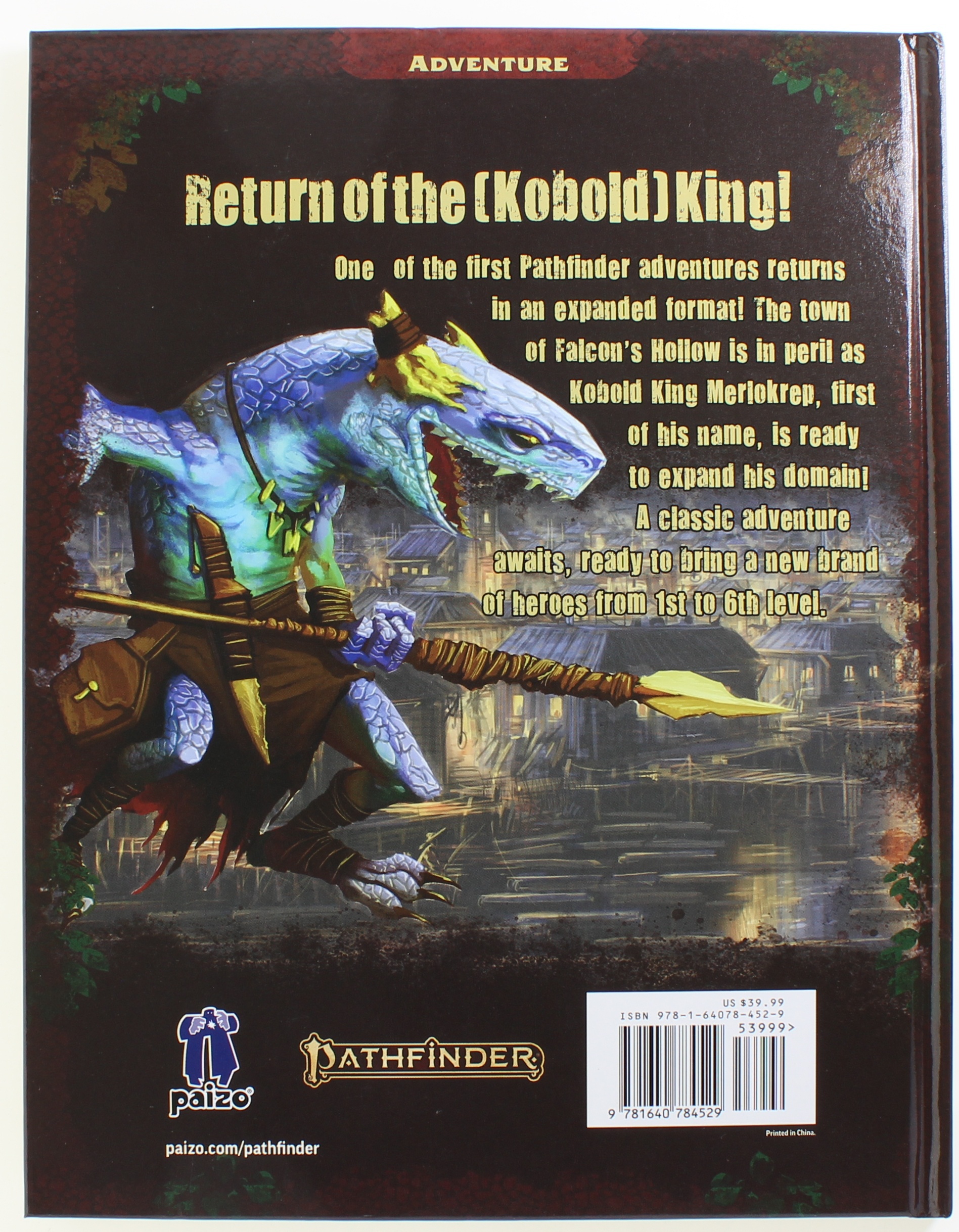 This deluxe, 128-page hardcover gathers three classic Pathfinder adventures into one unforgettable compilation, expanding them into a mini-campaign and introducing a brand-new dungeon level for heroes to explore. Completely updated to Pathfinder Second Edition, the insidious Kobold King and his minions return to bedevil a new generation of adventurers! Will your heroes save the town of Falcons Hollow from the Kobold King, or are they doomed to become the kings latest trophies?