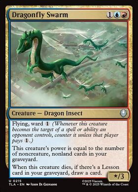 Oracle Text: Flying, ward {1} (Whenever this creature becomes the target of a spell or ability an opponent controls, counter it unless that player pays {1}.) This creature's power is equal to the number of noncreature, nonland cards in your graveyard. When this creature dies, if there's a Lesson card in your graveyard, draw a card.