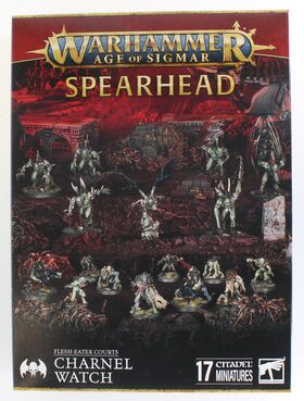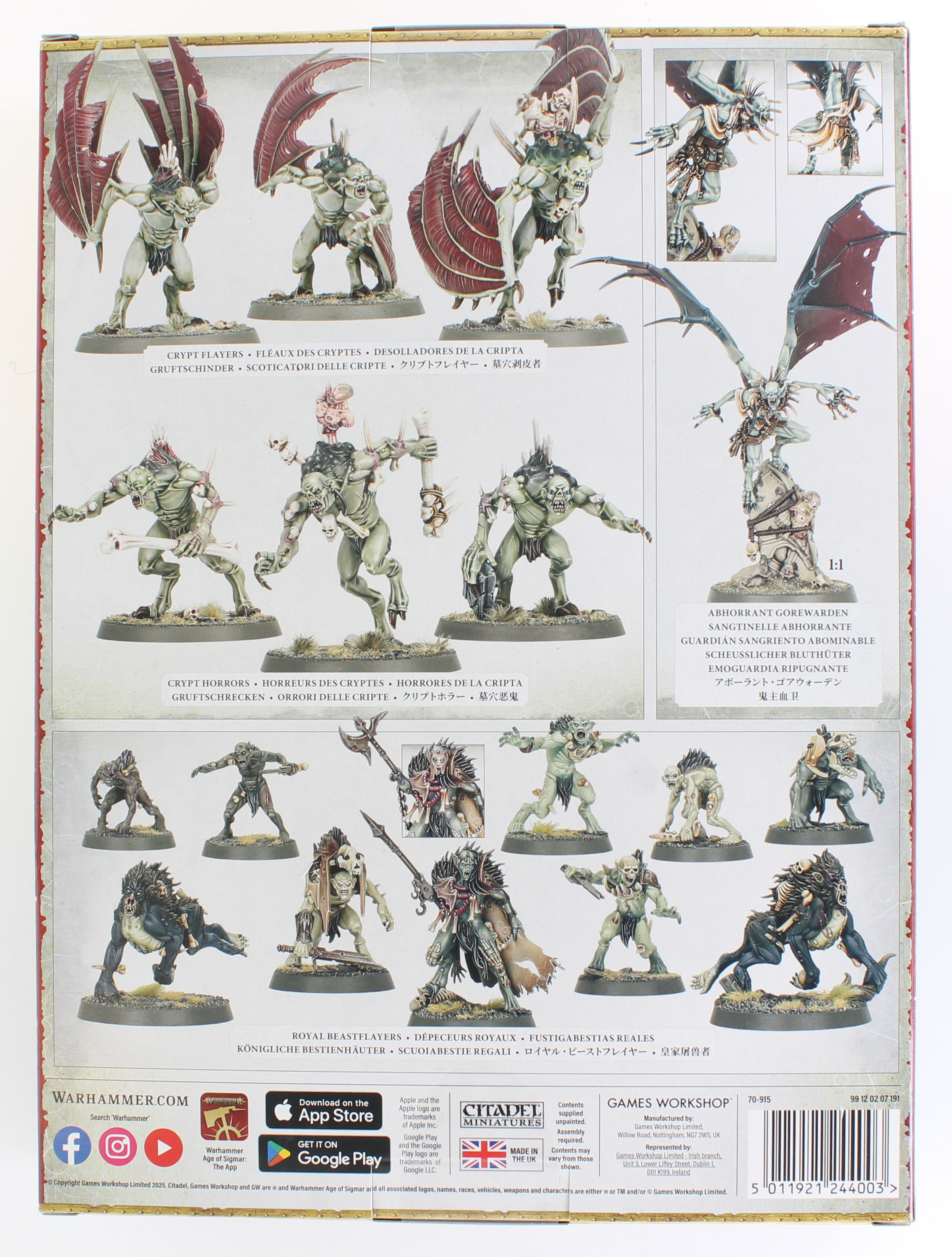 This new Spearhead is led by the terrifying Abhorrant Gorewarden, commanding three towering Crypt Horrors and three winged Crypt Flayers. At their side, a savage band of Royal Beastflayersled by a cunning Flaymasterunleash two monstrous Offal Hounds to hunt their prey to the last. 1 Abhorrant Gorewarden3 Crypt Horrors3 Crypt Flayers1 Royal Beastflayers unit Includes a Flaymaster and 2 Offal Hounds.Models in this box are supplied unpainted and require assembly.
