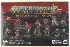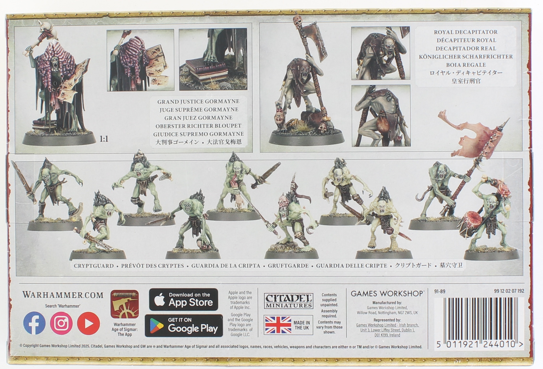 The Scarlet Jury bring swift and final judgment to their enemies. Led by Grand Justice Gormayne, this fearsome Regiment of Renown features 10 Cryptguard and a ruthless Royal Decapitator, ready to deliver verdicts by blade. Theyll fight for any Death or Destruction army, and even the Cities of Sigmar, Kharadron Overlords, and Slaves to Darkness can just about tolerate these fanatical enforcers when it serves their cause.In this box:1 Grand Justice Gormayne10 Cryptguard1 Royal DecapitatorModels in this box are supplied unpainted and require assembly.