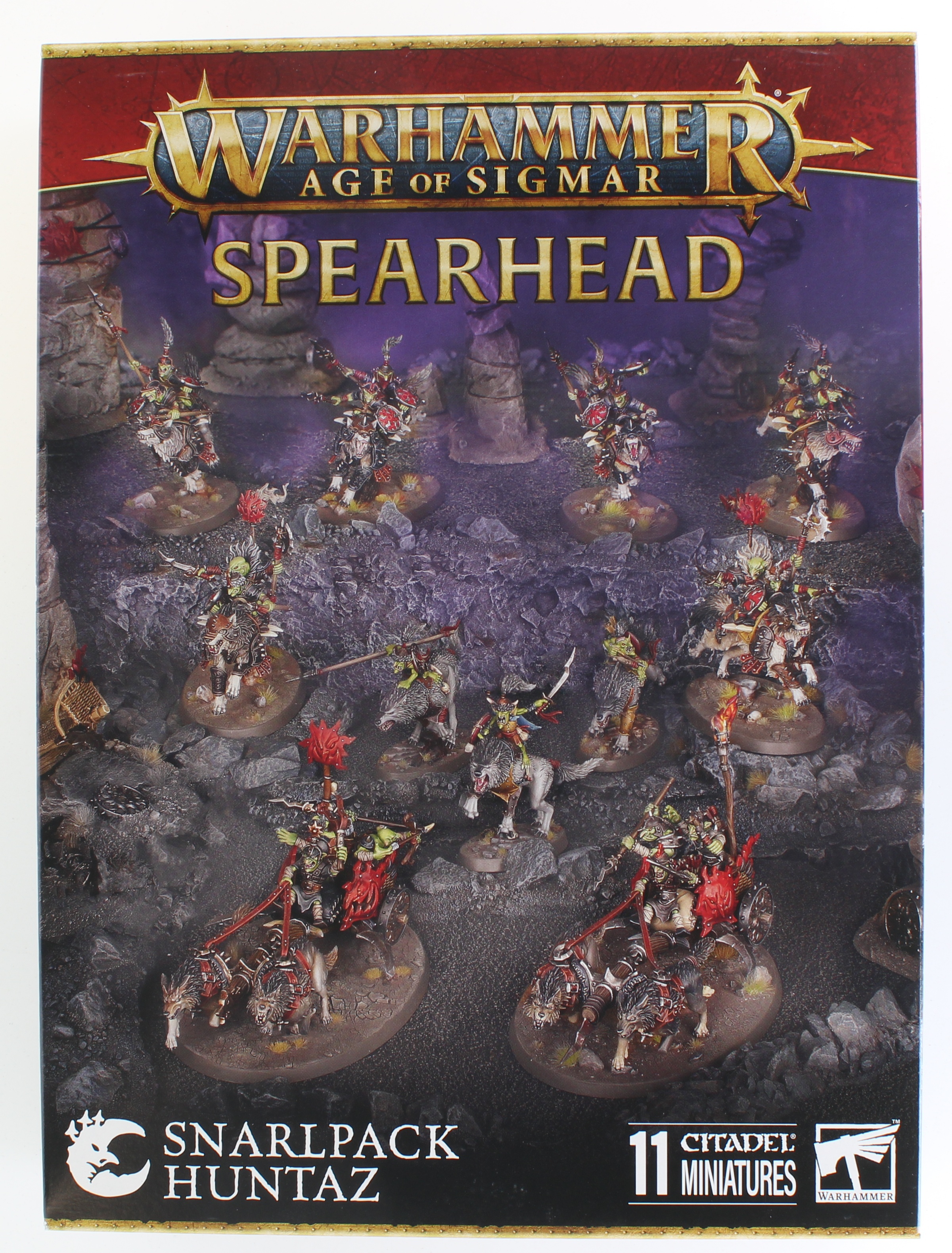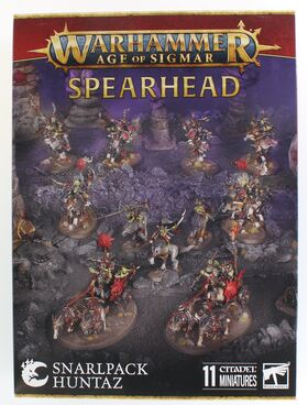 The Snarlpack Huntaz are a pack of speed-obsessed Gitmobs, forever chasing the strange creature they call the Glareface Frazzlegit and siphoning its wild energy into their jagged weapons. Swift and reckless, they crash into battle with more momentum than martial discipline.