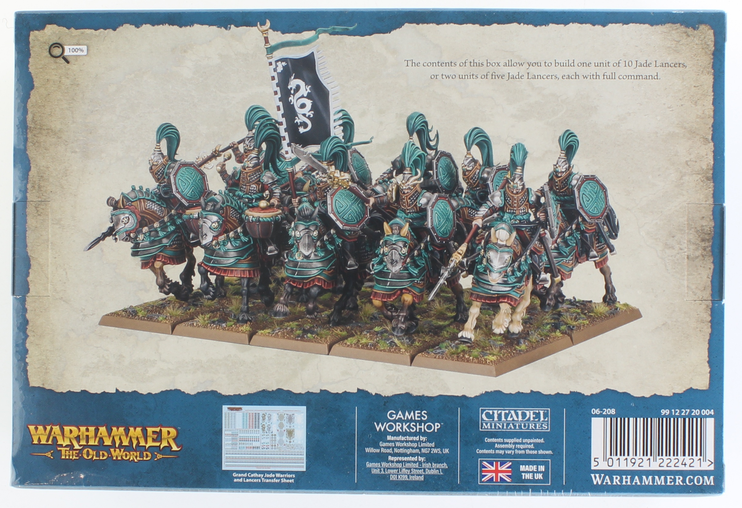 Attention: Due to limited supply on this item, we are unable to accept preorders for it at this time.Jade Lancers are Grand Cathay's elite heavy cavalry- linebreakers who smash through enemy ranks with spear and discipline. This kit builds 10 Jade Lancers, complete with enough command options to split them into two units of five. Inside you'll also find a Grand Cathay transfer sheet loaded with 404 decals, giving you everything you need to field these unstoppable riders in style.These models are supplied unpainted and require assembly.