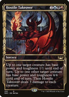 Oracle Text: Up to one target creature has base power and toughness 1/1 until end of turn. Up to one other target creature has base power and toughness 4/4 until end of turn. Then Hostile Takeover deals 3 damage to each creature.