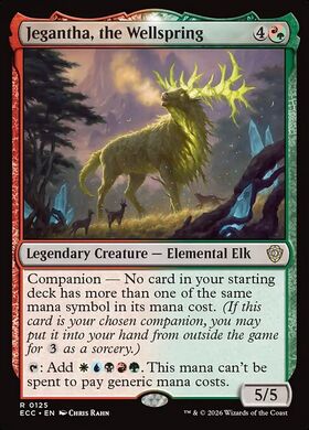 Oracle Text: Companion — No card in your starting deck has more than one of the same mana symbol in its mana cost. (If this card is your chosen companion, you may put it into your hand from outside the game for {3} as a sorcery.) {T}: Add {W}{U}{B}{R}{G}. This mana can't be spent to pay generic mana costs.