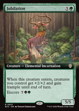 Oracle Text: When this creature enters, creatures you control get +2/+2 and gain trample until end of turn. Encore {7}{G}{G} ({7}{G}{G}, Exile this card from your graveyard: For each opponent, create a token copy that attacks that opponent this turn if able. They gain haste. Sacrifice them at the beginning of the next end step. Activate only as a sorcery.)