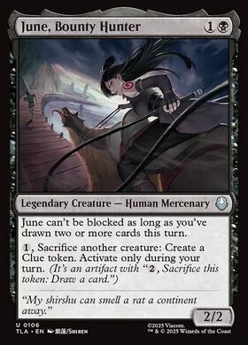 Oracle Text: June can't be blocked as long as you've drawn two or more cards this turn. {1}, Sacrifice another creature: Create a Clue token. Activate only during your turn. (It's an artifact with "{2}, Sacrifice this token: Draw a card.")