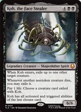 Oracle Text: When Koh enters, exile up to one other target creature. Whenever another nontoken creature dies, you may exile it. Pay 1 life: Choose a creature card exiled with Koh. Koh has all activated and triggered abilities of the last chosen card.