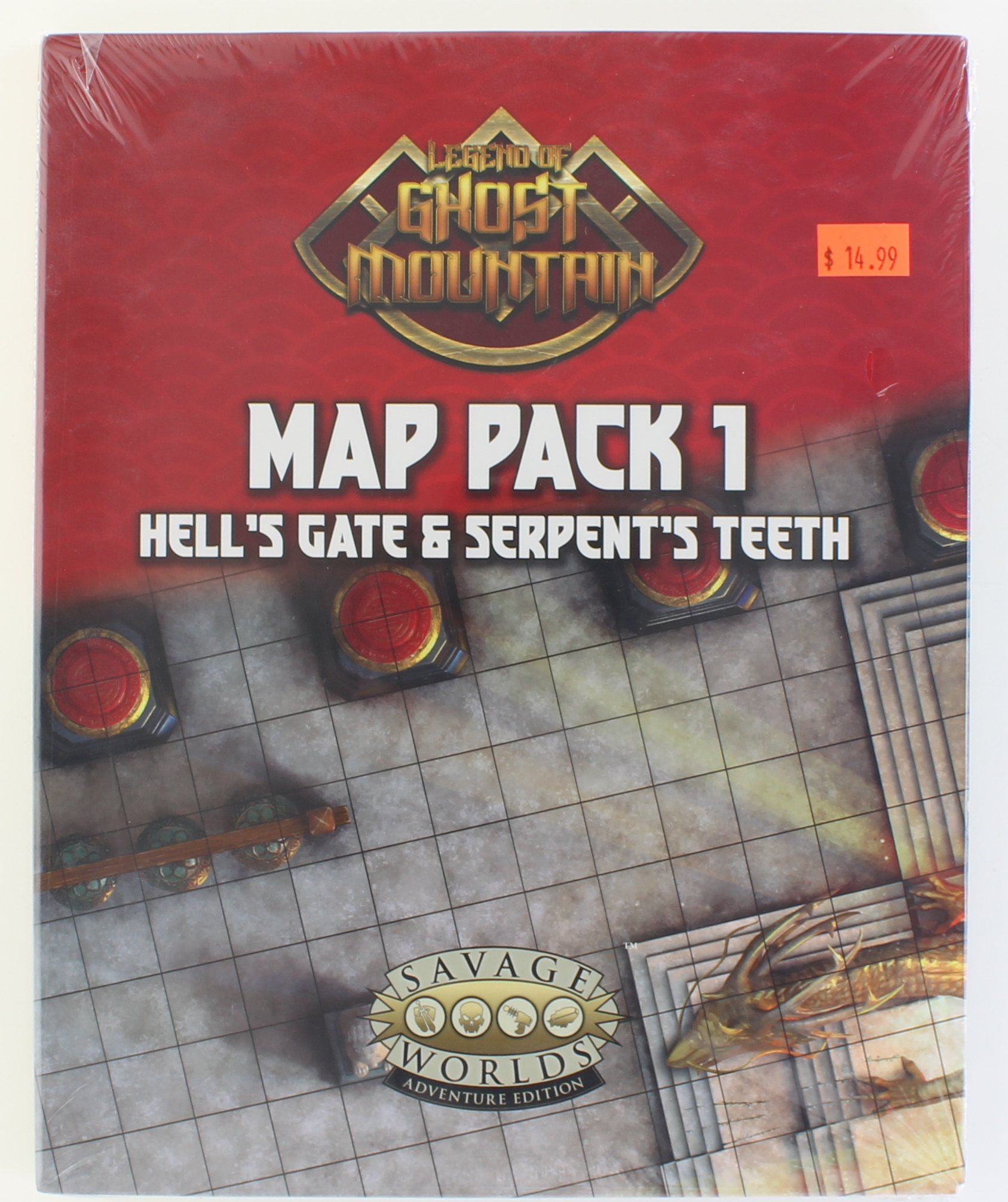 Legend of Ghost Mountain Map Packs are large, 30? x 24? double-sided laminated maps for use with miniatures or Legend of Ghost Mountain pawns. Theyre marked with a light one-inch grid, perfect for Savage Worlds. They are wet- and dry-marker erasable.