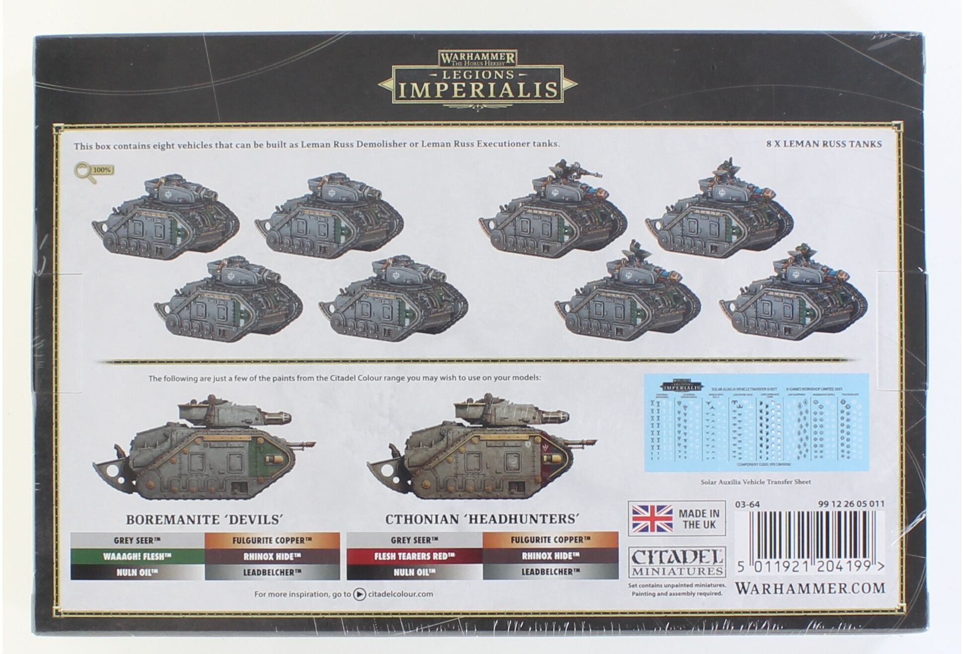 This ever-versitile tank is the Leman Russ and this kit builds yet 2 more variants to expand the battlefield roles in your army. This box builds 8 Leman Russ tanks 4 of which are Executioners which fields a Plasma Cannon, and the other 4 tanks are Leman Russ Demolishers equipped with Demolisher Cannons. Both variants have their own roles in your Solar Auxilia Army. The tanks in this box are supplied unpainted and require assembly.