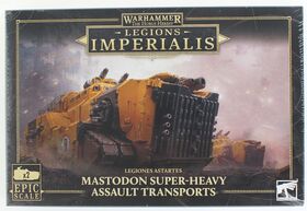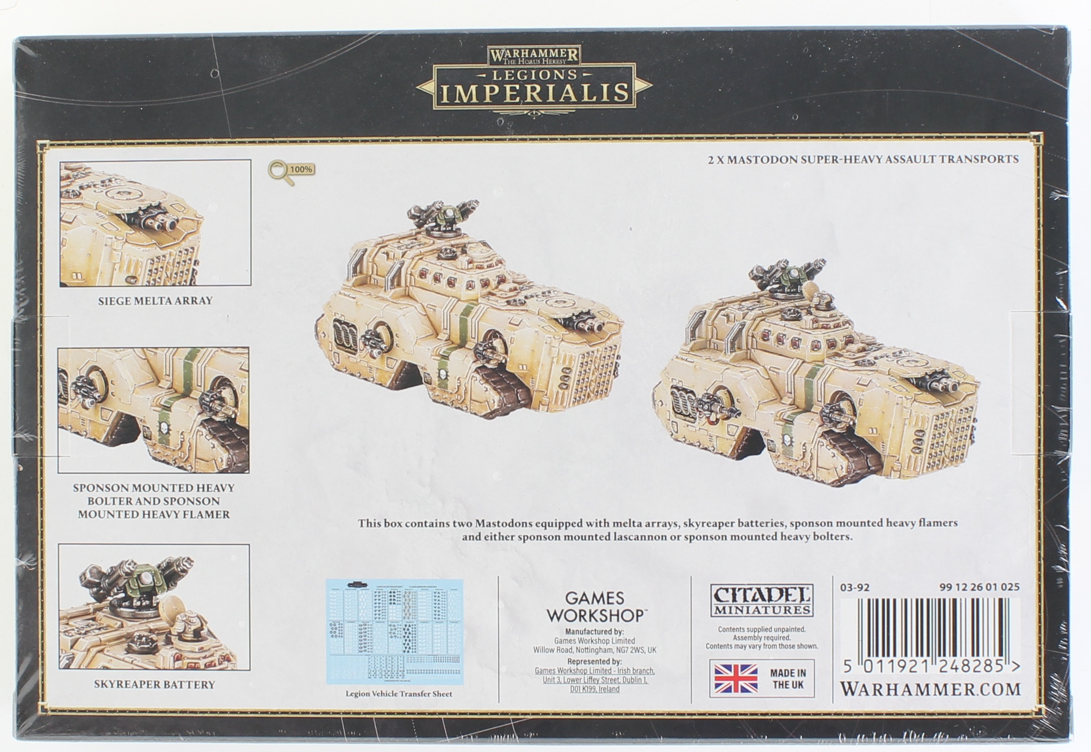 Few war machines embody the brutal might of the Legiones Astartes like the Mastodon Super-heavy Assault Transport. Towering over even a Land Raider, this colossal war engine smashes through enemy lines, deliving Space Marines across the battlefield. Its siege melta array reduces fortifications to rubble before unleashing its deadly cargo to seize the objective in a storm of fire and fury.This kit builds two Mastodon Super-heavy Assault Transports, each customizable with either sponson-mounted lascannons or heavy bolters, backed up by a skyreaper battery and sponson-mounted heavy flamers for overwhelming firepower. To complete the set, youll also find a Legiones Astartes transfer sheet packed with 1,130 decals- perfect for finishing these unstoppable engines of war with Legion heraldry.These models are supplied unpainted and require assembly.