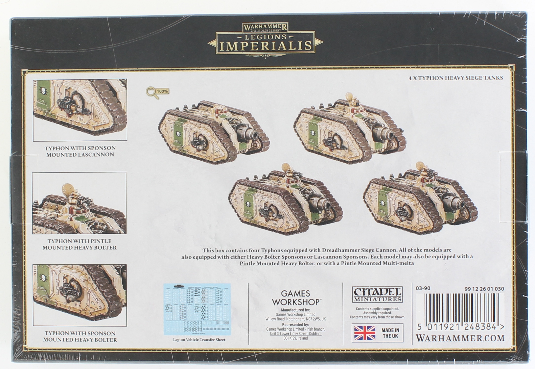 The Typhon Heavy Siege Tank is a rolling fortress of destruction armed with a colossal dreadhammer siege cannon. Designed to give the Legions unmatched mobile firepower, the Typhon smashes through fortifications and obliterates enemy strongpoints with ease.This kit builds four Typhon Heavy Siege Tanks, each with your choice of sponson-mounted lascannons or heavy bolters, plus a pintle-mounted heavy bolter or multi-melta for added versatility. The set also includes a Legiones Astartes vehicle transfer sheet with 1,130 decals.These models are supplied unpainted and require assembly.