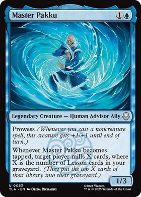 Oracle Text: Prowess (Whenever you cast a noncreature spell, this creature gets +1/+1 until end of turn.) Whenever Master Pakku becomes tapped, target player mills X cards, where X is the number of Lesson cards in your graveyard. (They put the top X cards of their library into their graveyard.)