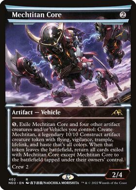 Oracle Text: {5}, Exile Mechtitan Core and four other artifact creatures and/or Vehicles you control: Create Mechtitan, a legendary 10/10 Construct artifact creature token with flying, vigilance, trample, lifelink, and haste that's all colors. When that token leaves the battlefield, return all cards exiled with Mechtitan Core except Mechtitan Core to the battlefield tapped under their owners' control. Crew 2
