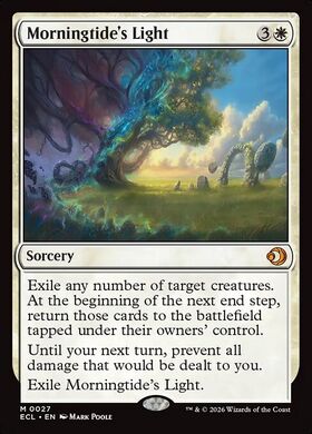 Oracle Text: Exile any number of target creatures. At the beginning of the next end step, return those cards to the battlefield tapped under their owners' control. Until your next turn, prevent all damage that would be dealt to you. Exile Morningtide's Light.