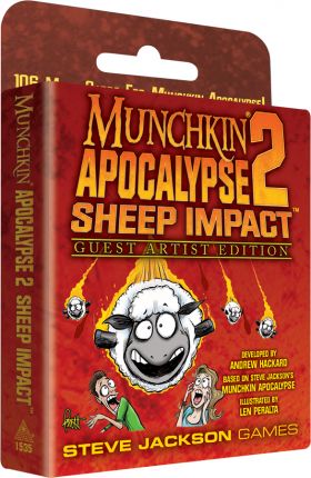 Arm your hardened survivor with the Patriot Axe and Ketchup Gas to take on the The Thawed Reich! Protect yourself with the Bomb Suit and Survival Manual, or the Antisocial Media will end you prematurely! Watch out for Disaster! Velocirapture! and terrifying new Seals like The Singularity! Play a new Class, the Daredevil, and thumb your nose at apocalyptic peril! Go up against mutants, bandits, and the Seals of the Apocalypse with this Guest Artist Edition of Munchkin Apocalypse 2: Sheep Impact - featuring brand-new art by Len Peralta (TenState, Exterminite, Munchkin: The Guild).