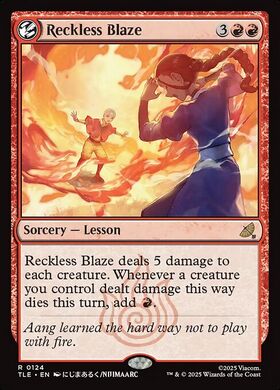 Oracle Text: Reckless Blaze deals 5 damage to each creature. Whenever a creature you control dealt damage this way dies this turn, add {R}.