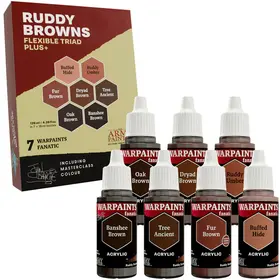 Leather armour, fur cloaks, ancient tree beingsthe Flexible Triad PLUS+ Ruddy Browns is perfectly suited for it all and much more. This set of seven colours progresses from the dark brown of wet mud to a softer buff for leather highlights. The addition of John Blanche: Banshee Brown gives you the option to delve even deeper into earthy tones.
