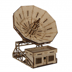 The Dish has a 9 by 8 inch footprint and is 12 inches tall with a 'structural steel' style framework. The dish itself measures 10 inches across. The control bunker may be placed in the dish or placed separately on the table. Our models are made of precision, laser-cut 3mm MDF and require assembly.