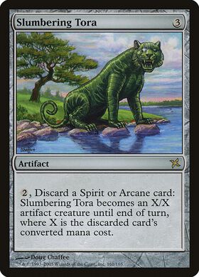 Oracle Text: {2}, Discard a Spirit or Arcane card: Slumbering Tora becomes an X/X Cat artifact creature until end of turn, where X is the discarded card's mana value.
