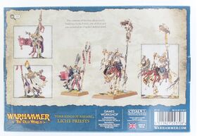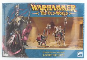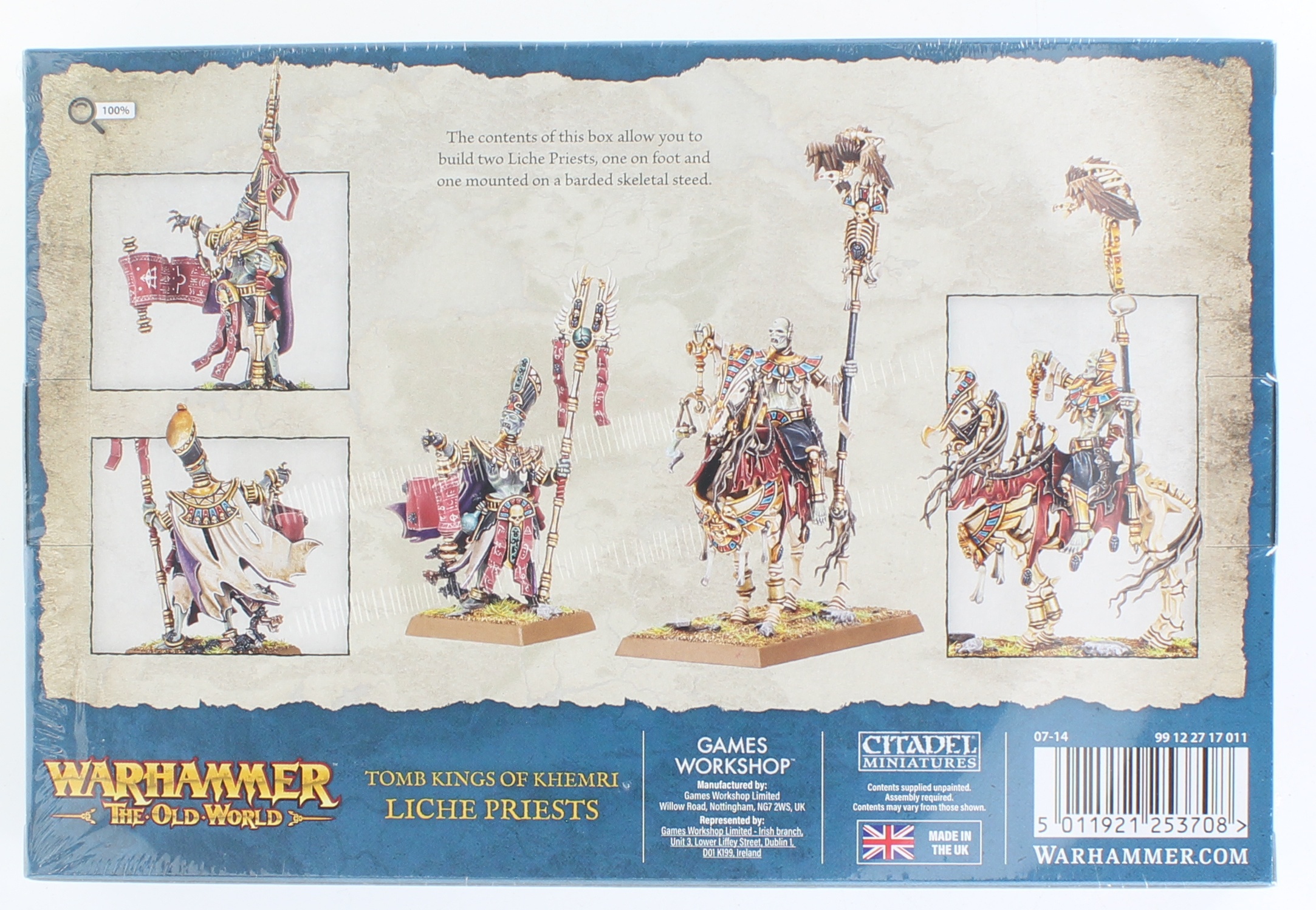 Channel the dark might of the Mortuary Cult with the Liche Priests! This new plastic kit builds two sinister spellcasters one striding into battle on foot, the other mounted on a barded skeletal steed. Customize your priests with a trove of interchangeable options, including four different head options, Multiple staff toppers and more. Perfect for leading your Tomb Kings of Khemri, these Liche Priests bring ancient sorcery and sinister presence to your battlefield.