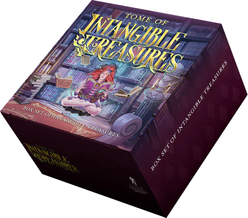 This box set includes 380 tarot-sized reference cards for each of the boons, blessings, charms, and pacts found within Tome of Intangible Treasures. These cards can be used independently of the book or alongside it as reference cards and handouts for players, and the box includes a small booklet with guidance for using boons, charms, and pacts in your game. The cards are gorgeously illustrated with flavorful art from the book, and enhanced with gilded edges for a luxurious look. A hard, telescoping box with a plastic insert ensures the cards remain snugly stored and well protected between use.