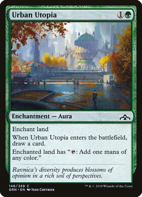 Oracle Text: Enchant land When Urban Utopia enters the battlefield, draw a card. Enchanted land has "{T}: Add one mana of any color."