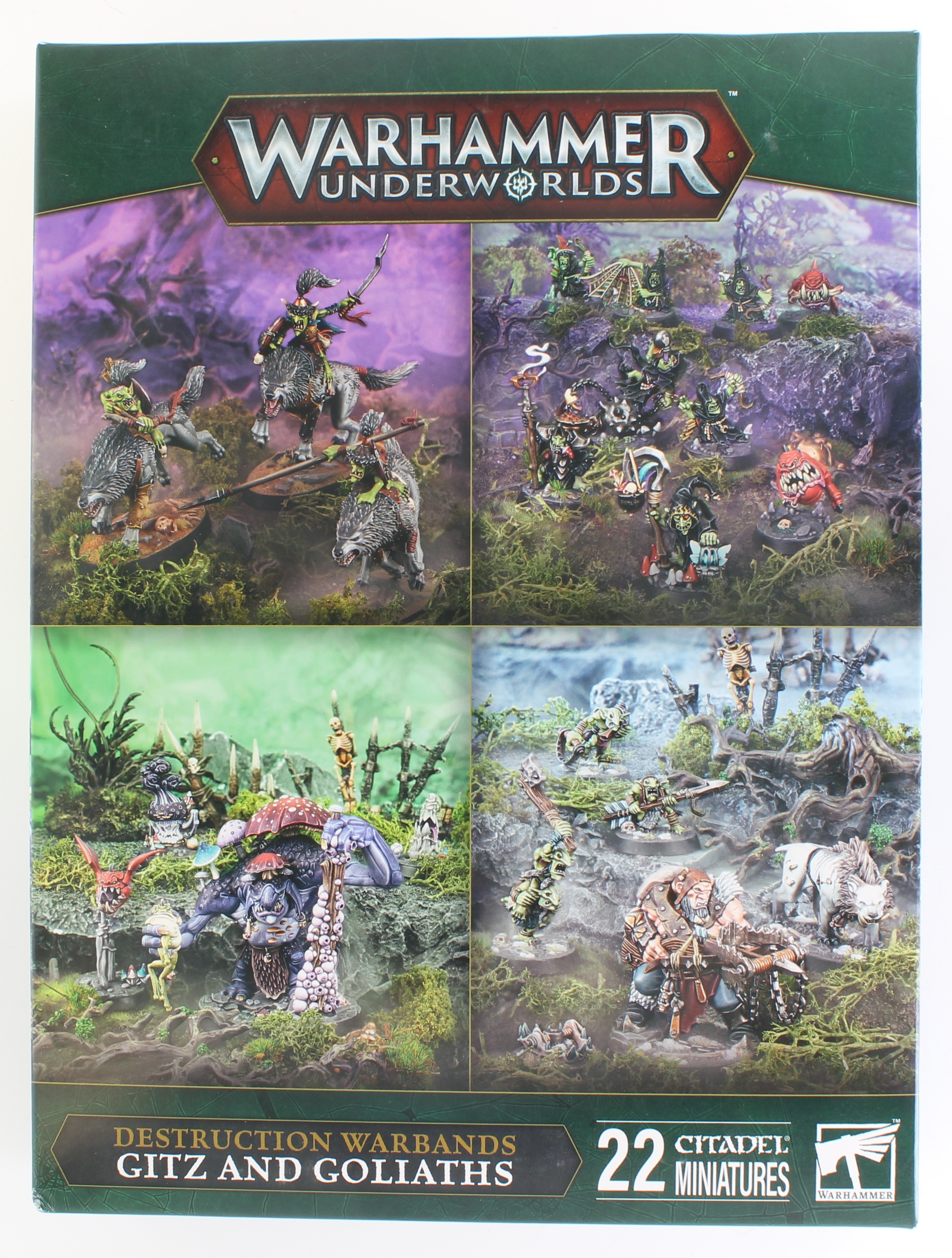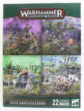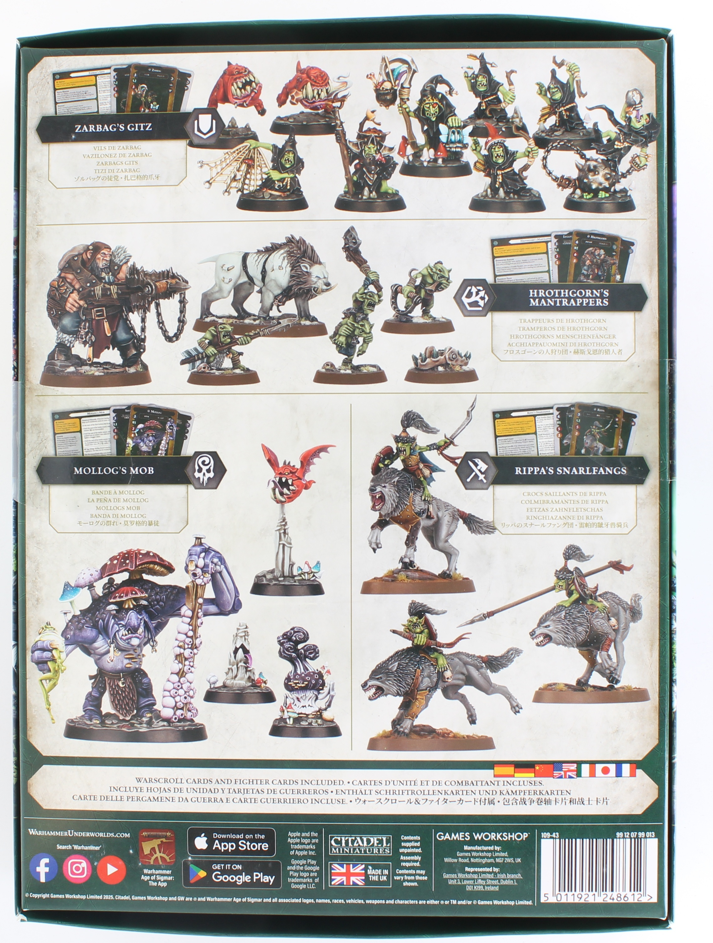 Crush, chomp, and cause chaos with Gitz and Goliaths! This brutal box set throws together a wild mix of ogors, troggoths, and grots all hungry for glory. Inside youll find four warbands: Hrothgorns Mantrappers, Rippas Snarlfangs, Mollogs Mob, and Zarbags Gitz each ready to smash through enemies and scrap for dominance in Warhammer Underworlds.